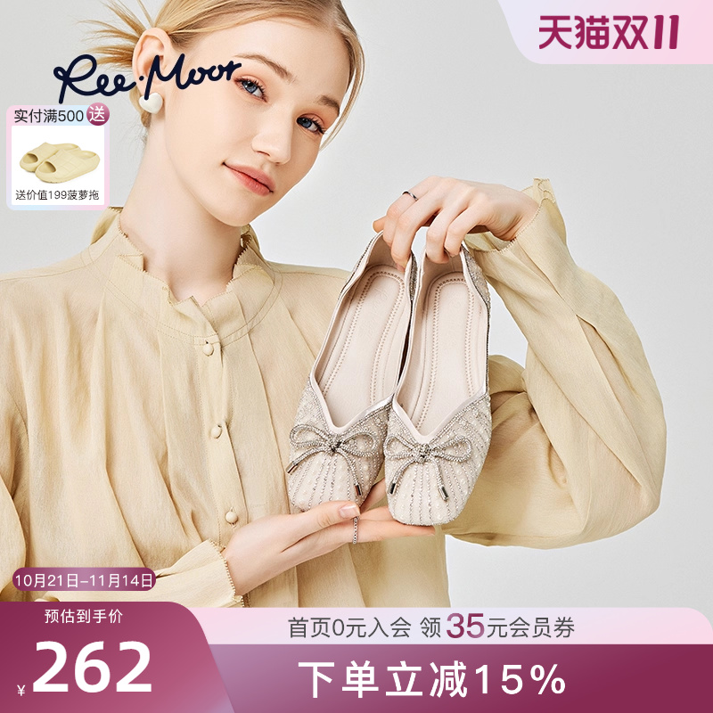 REEMOOR睿慕水钻单鞋女2025秋新款浅口珍珠蝴蝶结船鞋平底鞋婚鞋