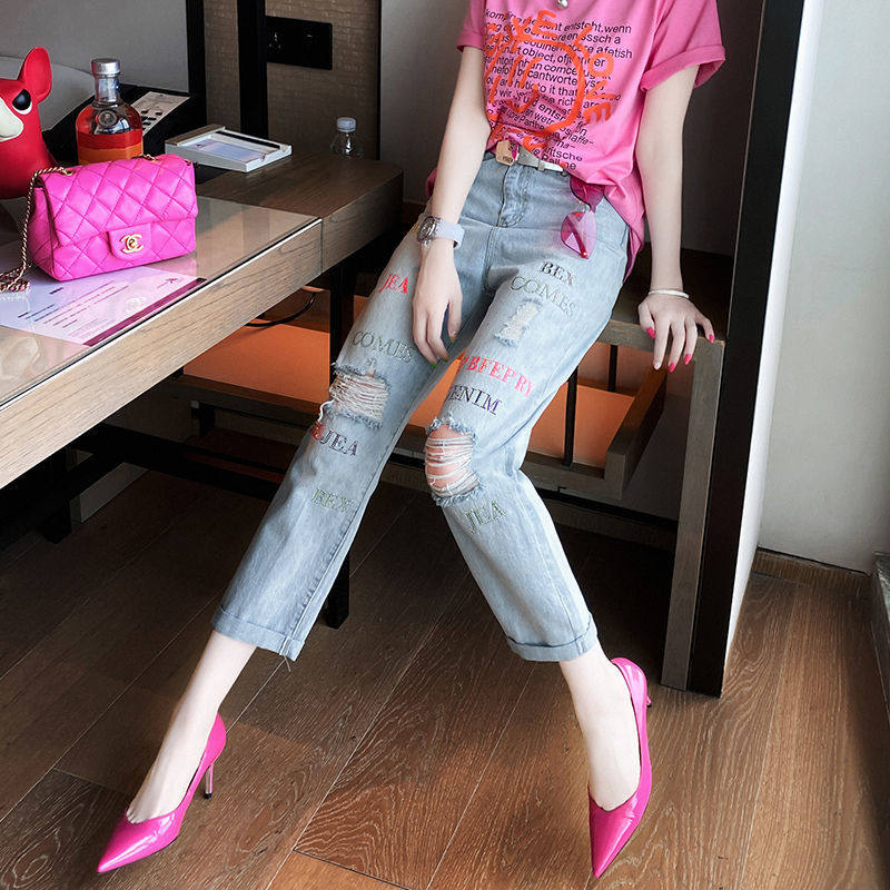 破洞牛仔裤女九分裤2022年夏秋新款字母绣花百搭宽松高腰直筒裤潮