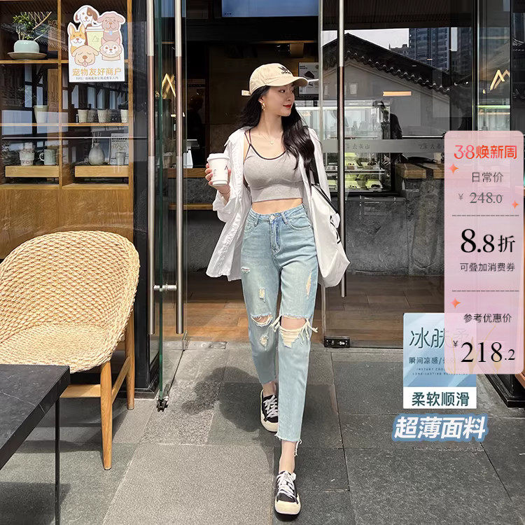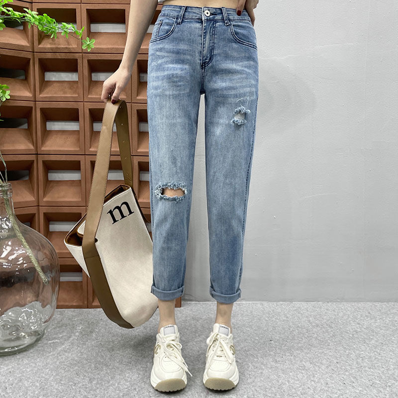 超薄款~!破洞老爹牛仔裤女九分春夏新款小个子冰肤柔哈伦萝卜裤
