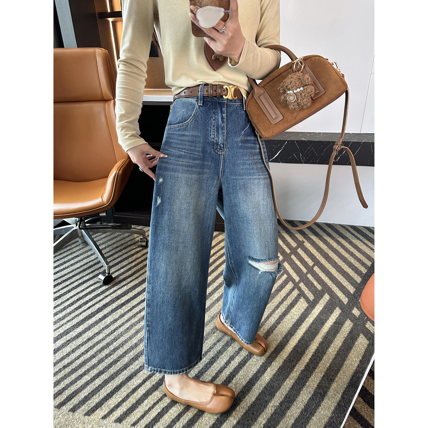 自带时髦感~!八九分毛边破洞牛仔裤女2026春新款宽松直筒阔腿裤