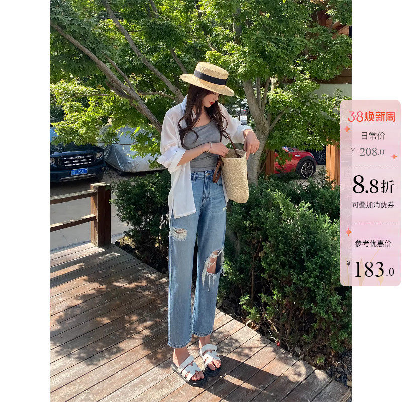 李李服饰窄版破洞直筒牛仔裤女26春季新款高腰修身显瘦直筒九分裤