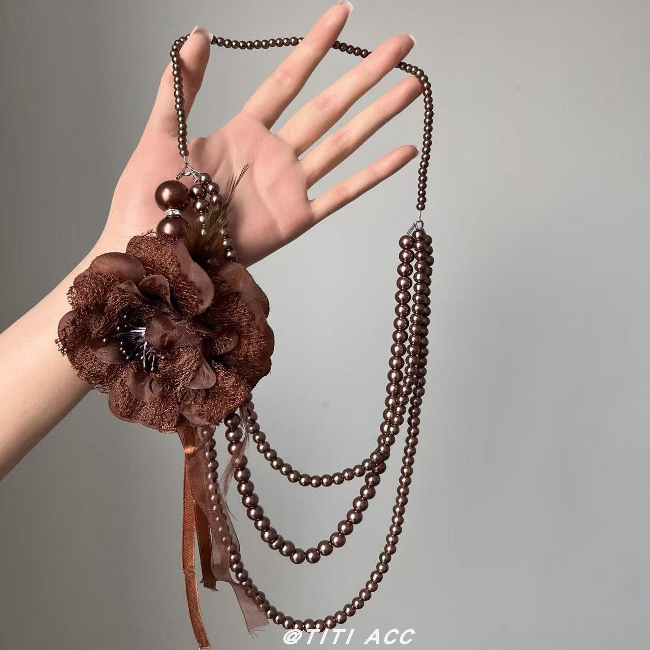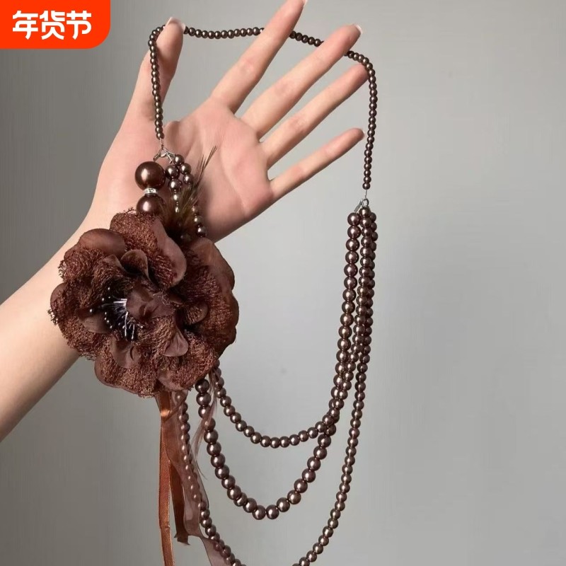 复古仿珍珠蕾丝花项链女生长款三层骨链氛围感毛衣链多层颈链花朵