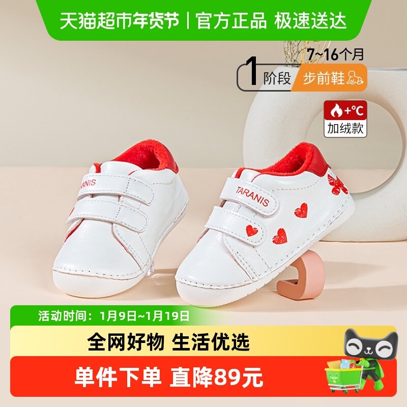 泰兰尼斯冬季新款加绒女童鞋婴儿步前鞋羊皮软底男宝宝爱心小白鞋