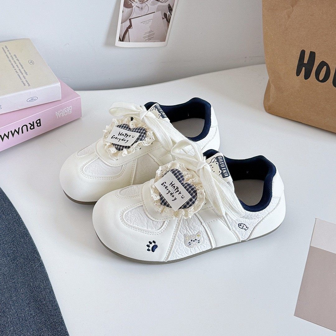 韩版圆头少女感泡芙鞋女2026新款春季小清新蕾丝爱心小白鞋德训鞋