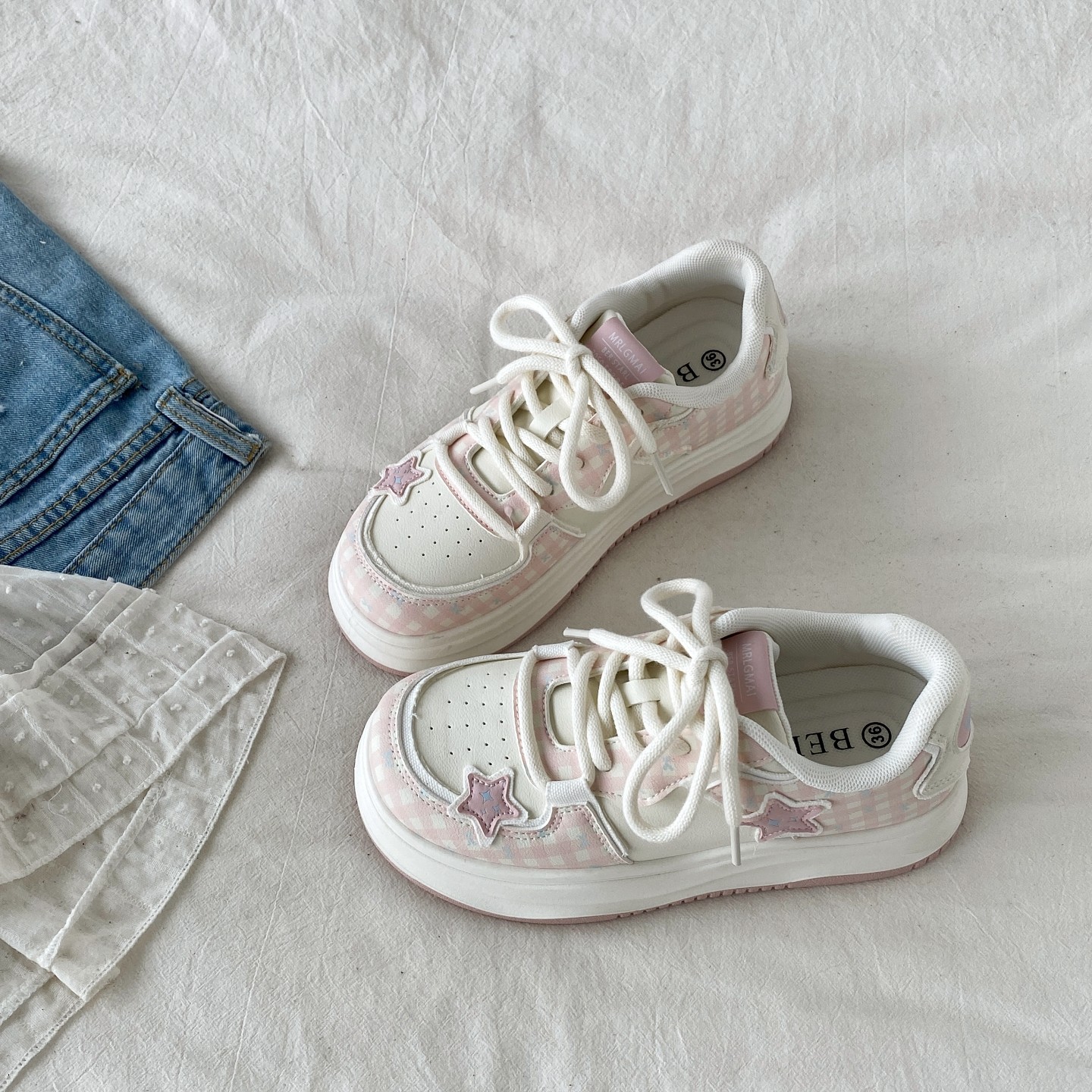 喜叔粉色小众星星板鞋女款春季chic百搭厚底爱心小白鞋休闲运动鞋