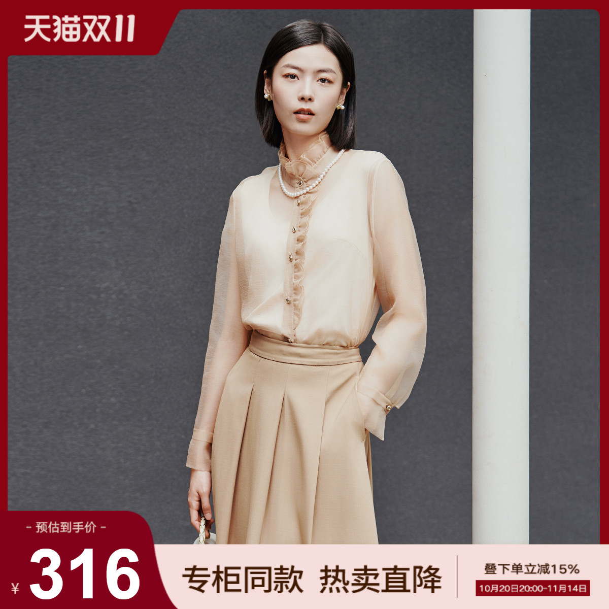 YongLeap柜品秋冬新品气质名媛风荷叶边装饰网纱两件套单排扣衬衣