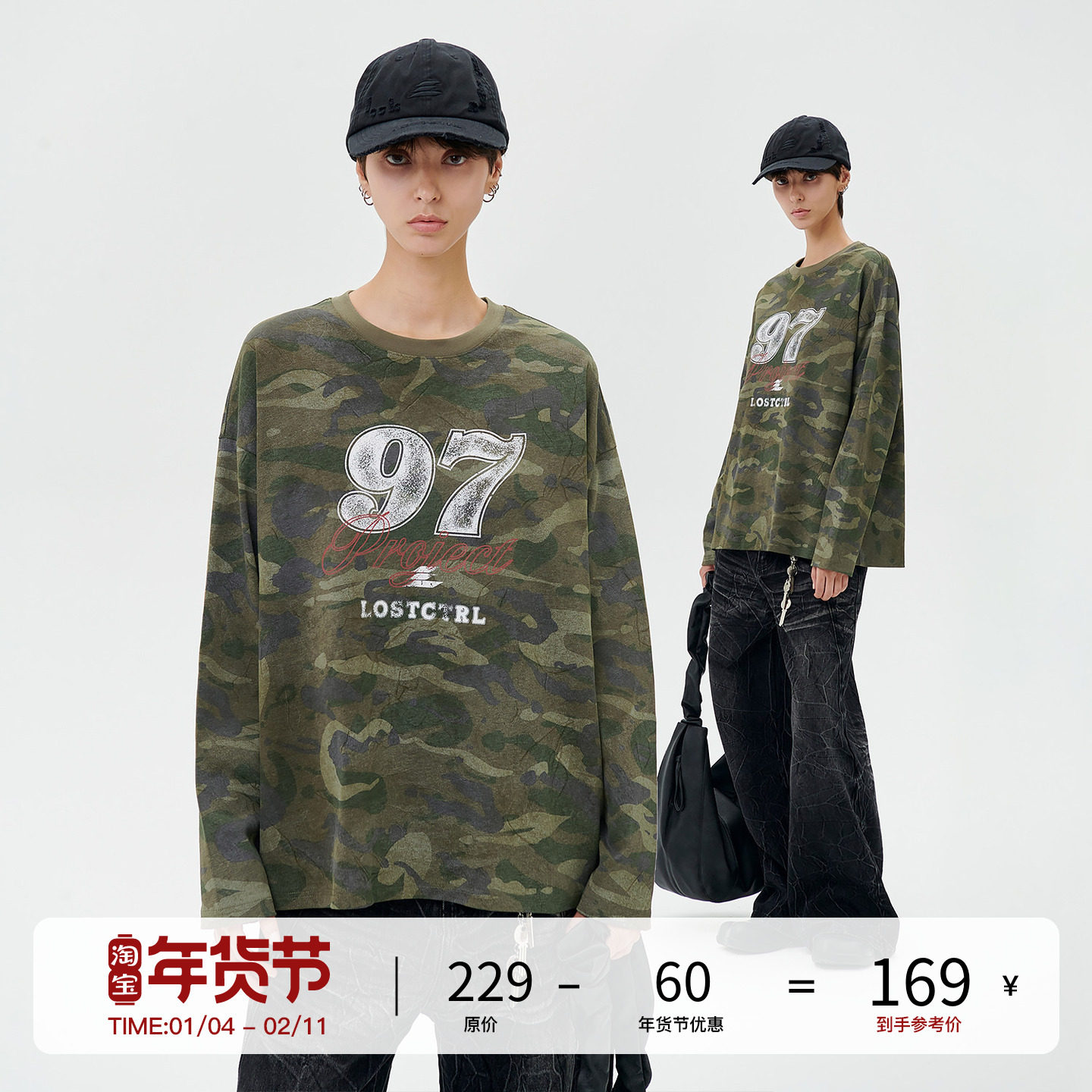 LOSTCTRL 初秋新款美式复古迷彩数字印花宽松圆领长袖T恤男女同款