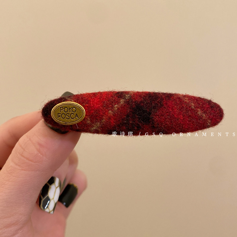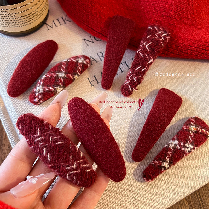 复古新年红色格纹毛呢发夹女高级感刘海鸭嘴夹侧边碎发bb夹子发饰