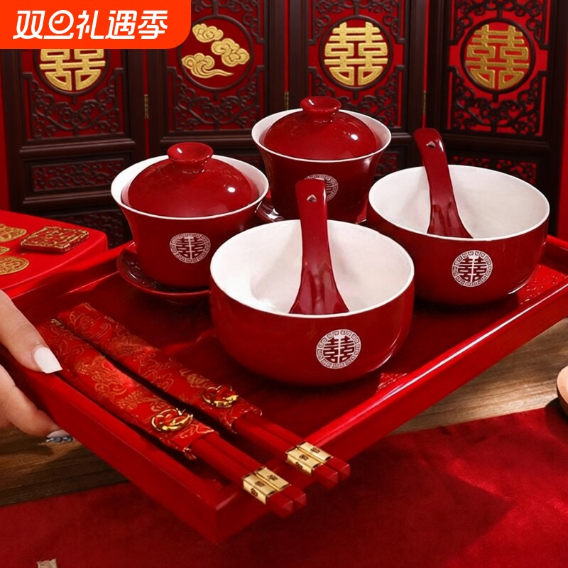 新婚高档敬茶杯喜碗套装实用碗筷改口茶具新中式娘家结婚陪嫁用品