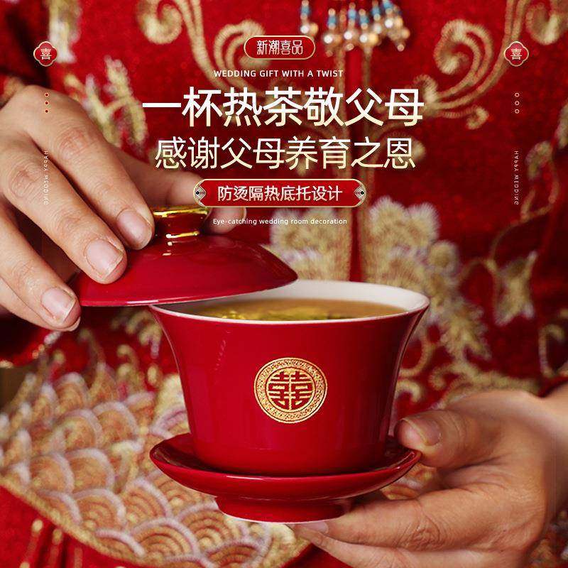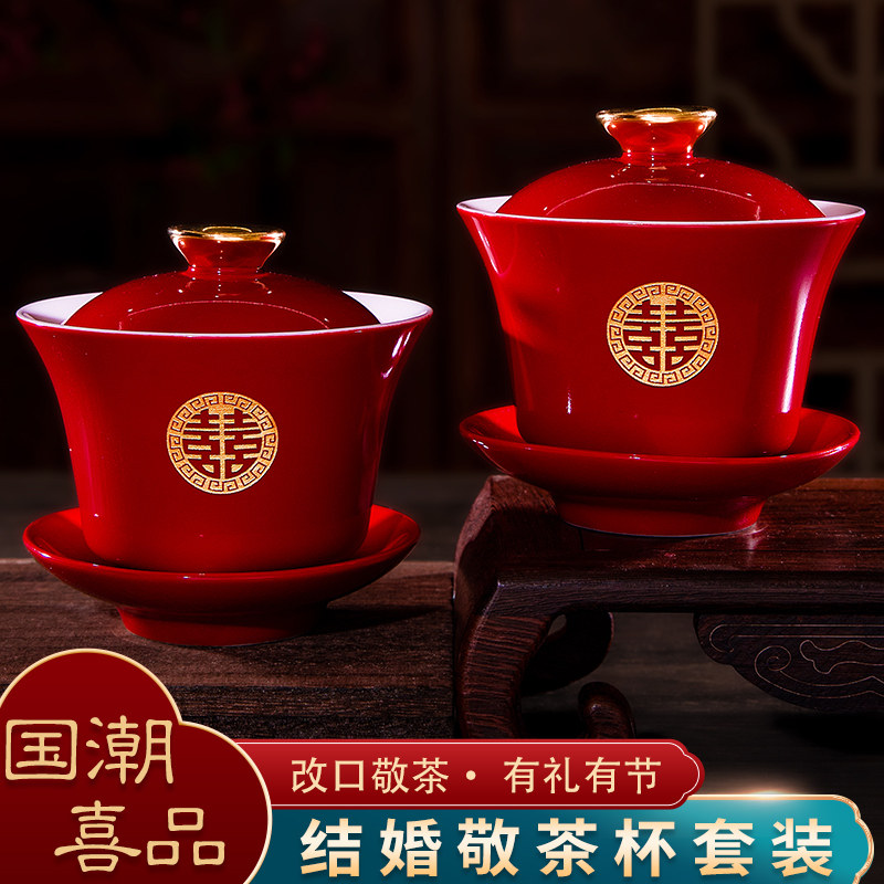 敬茶杯结婚陪嫁用品改口敬酒茶杯套装盖碗婚礼红色娘家敬酒杯陪嫁