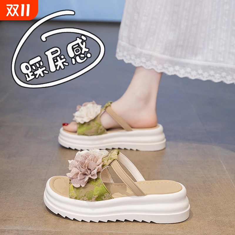 花朵拖鞋女软底外穿2025夏季新款厚底仙女风大码海边沙滩一字凉拖