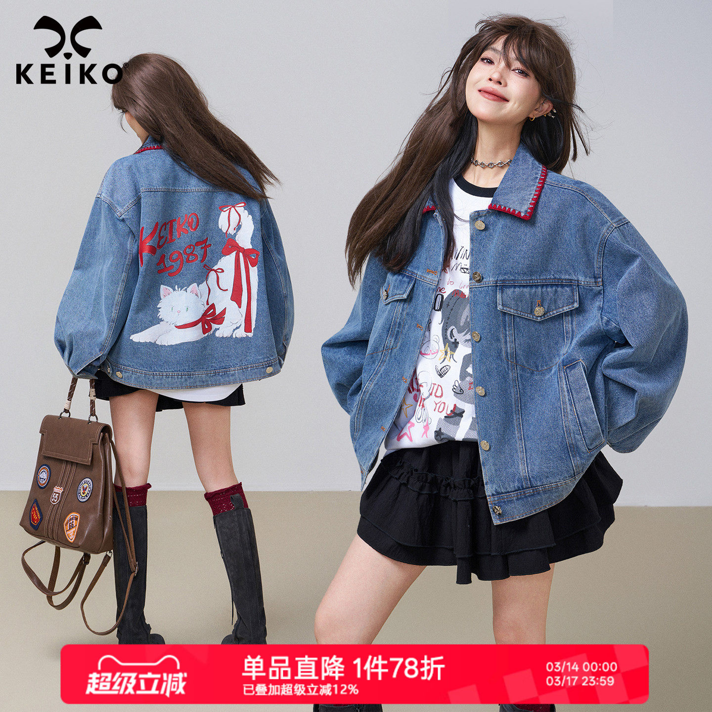 KEIKO 甜系印花宽松牛仔外套女春季复古撞色机绣锁边翻领休闲夹克