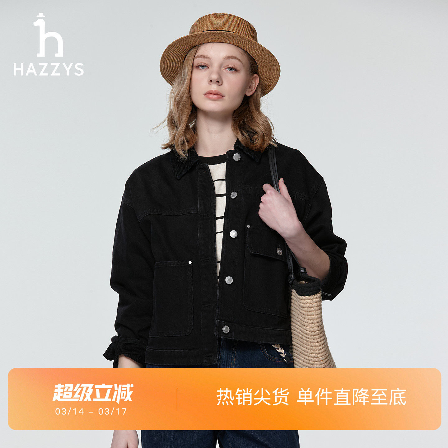 Hazzys哈吉斯牛仔夹克女春季时尚潮流宽松复古灯芯绒拼接翻领外套