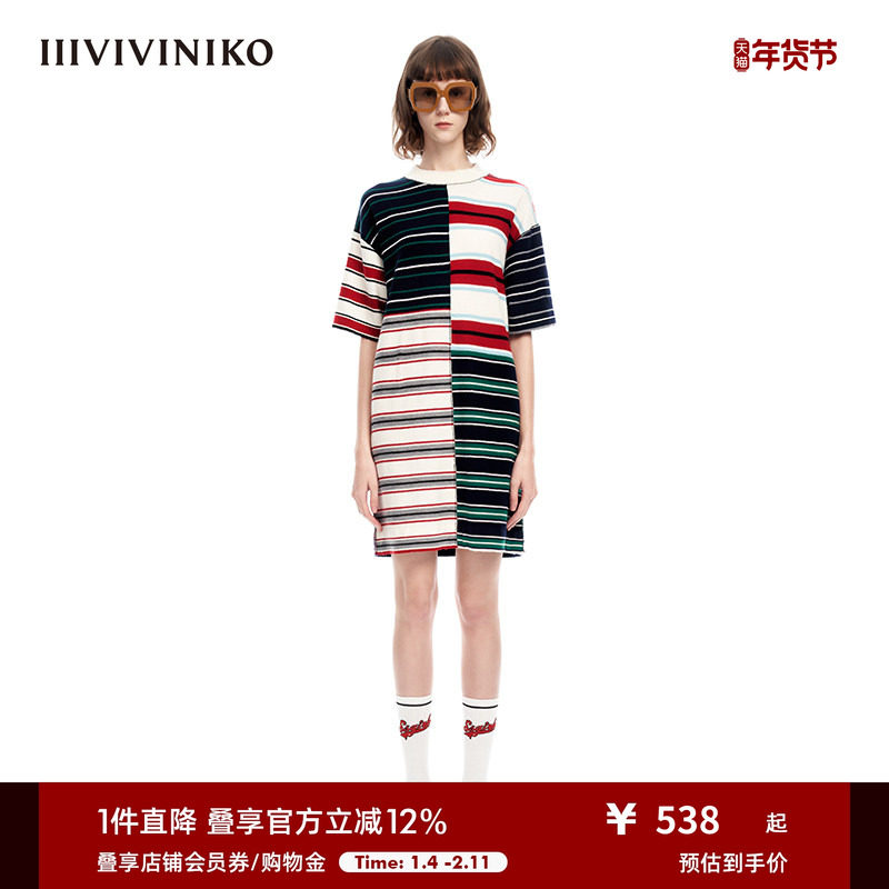 IIIVIVINIKO春夏新品拼色条纹直筒松身针织连衣裙女M311105616A
