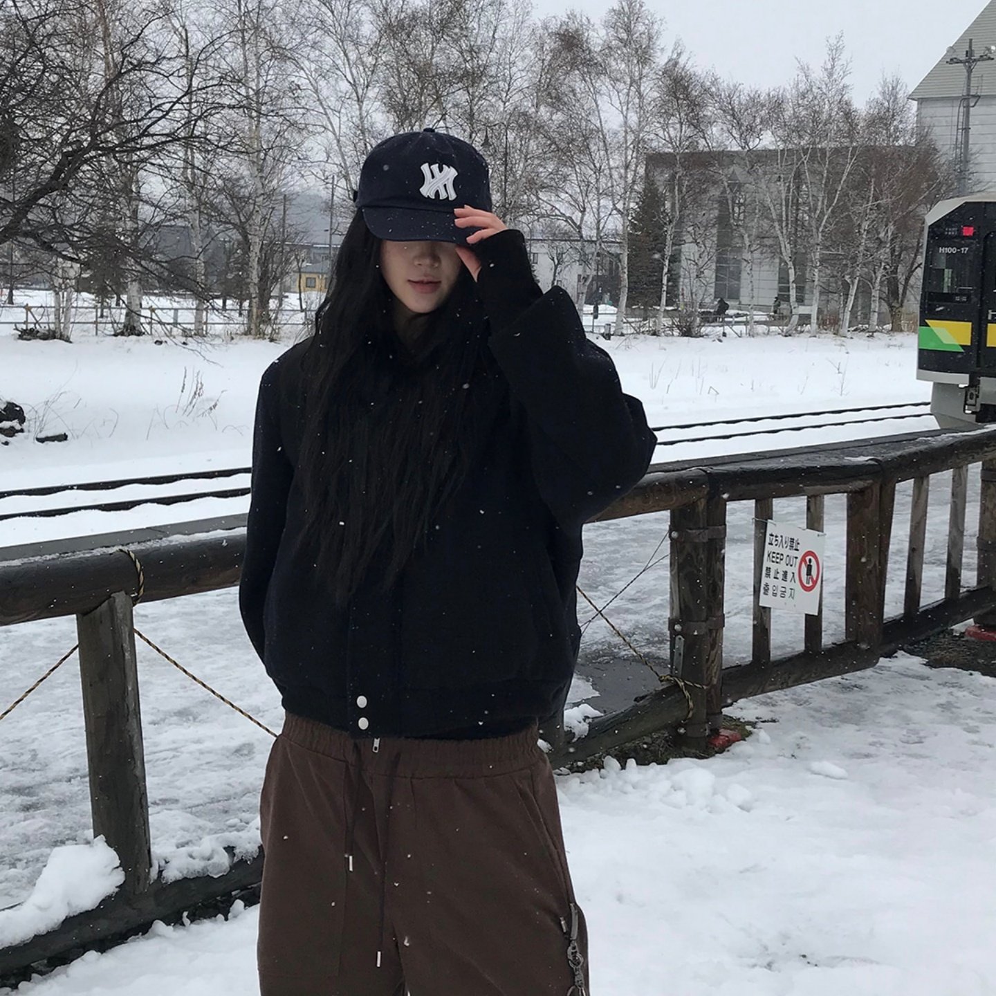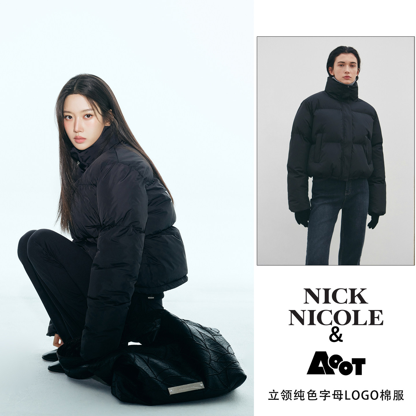 文佳英同款nick nicole韩国代购短款立领纯色字母logo棉服外套女