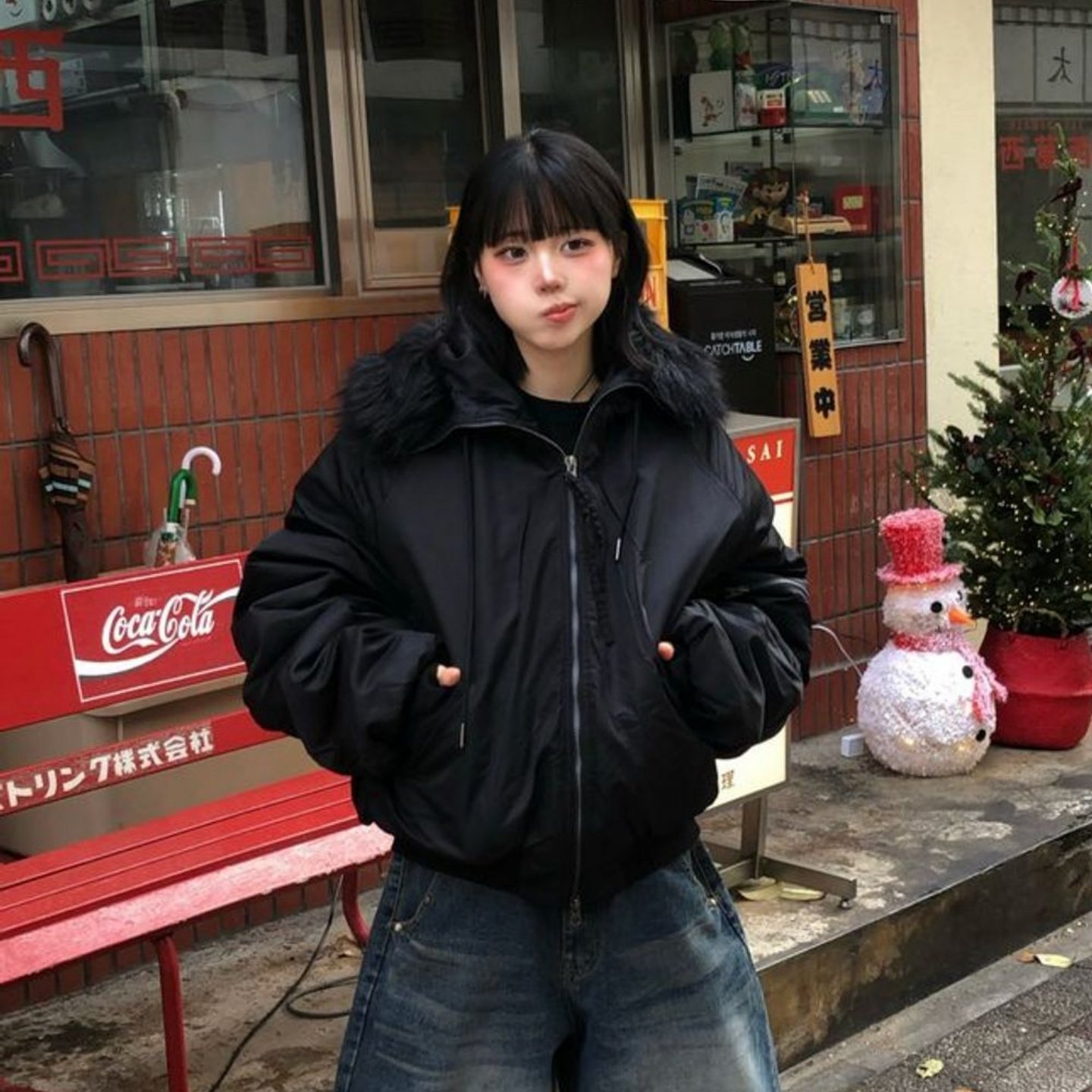 韩国代购大码女装2025靓丽冬装新款毛毛翻领拉链时尚保暖短款棉衣