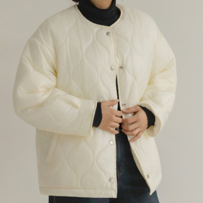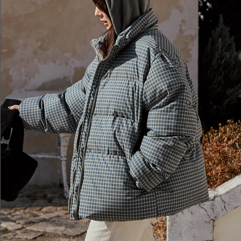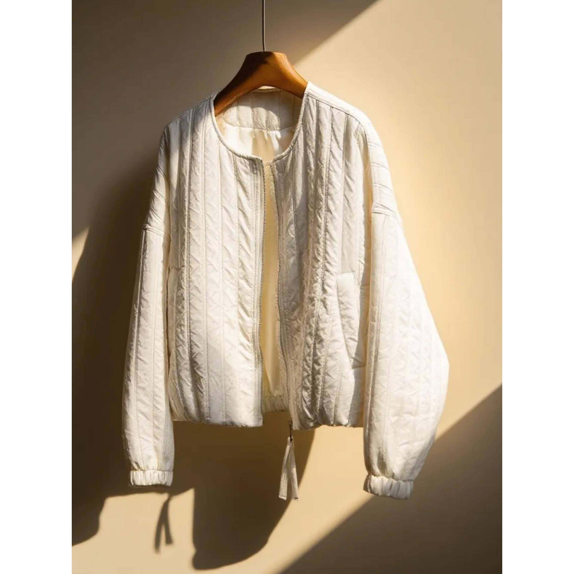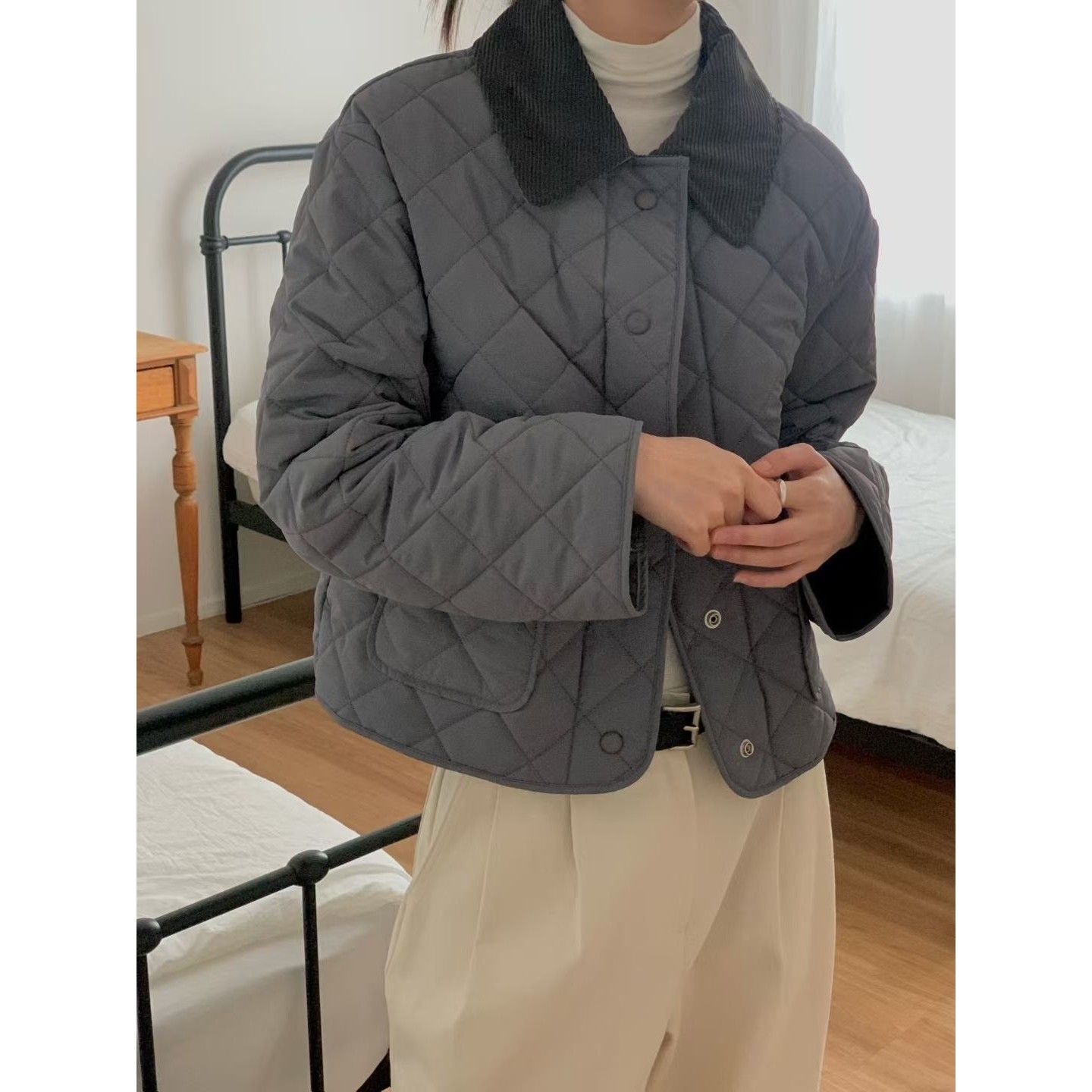 韩国轻薄菱格棉服女冬季新款小个子圆领宽松保暖短款夹棉白色外套