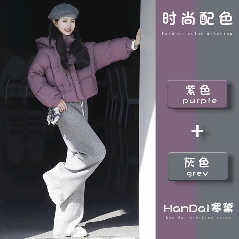 韩国深冬装搭配一整套短款棉服套装女小个子高级感灰色卫裤两件套