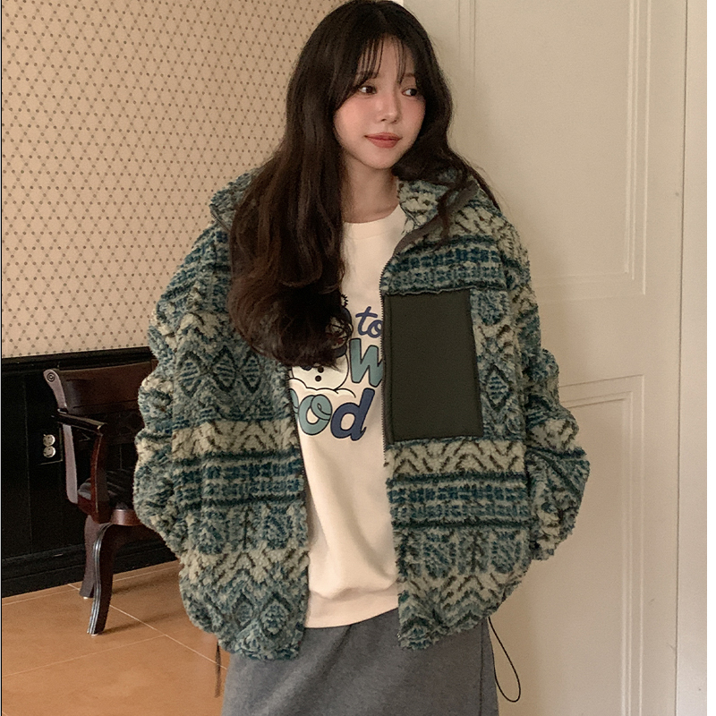 韩国代购大码女装2025靓丽冬装新款翻领拉链配色羊羔绒短款棉衣