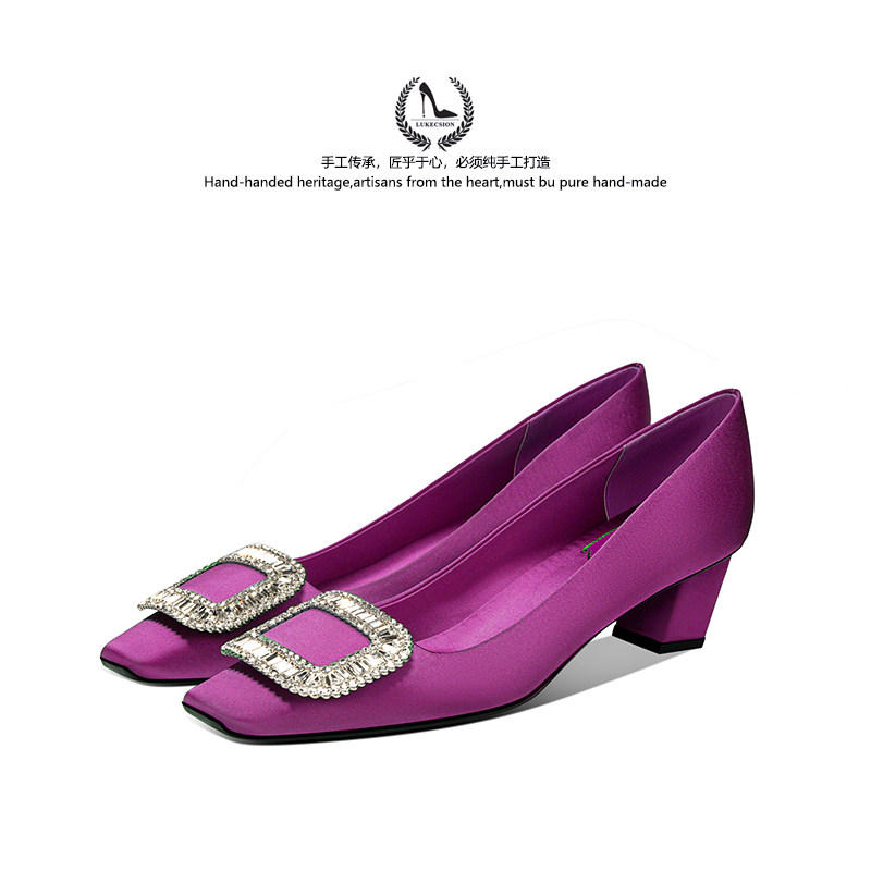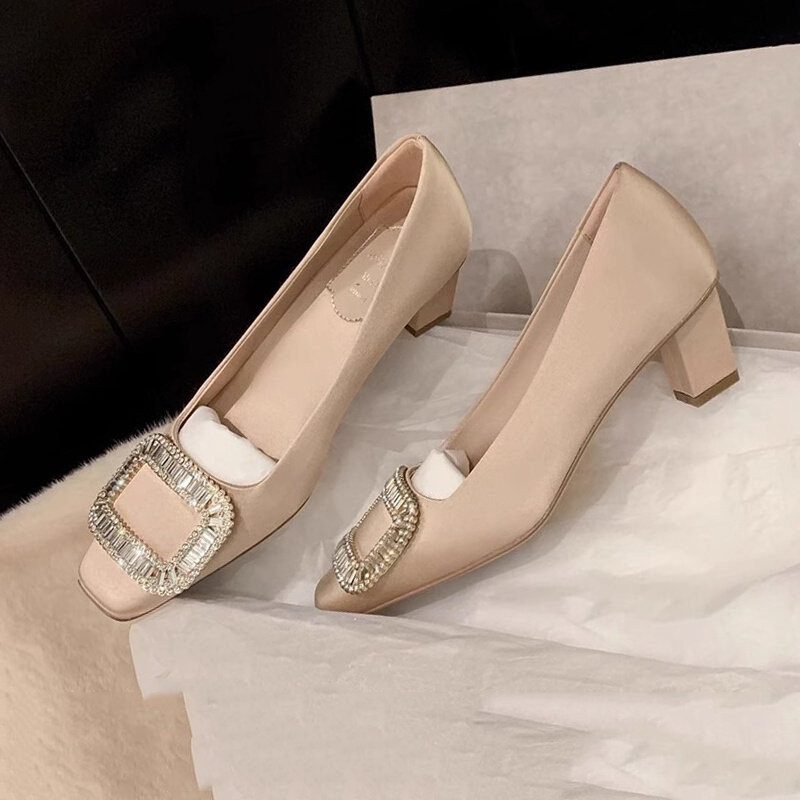 绸缎高跟鞋女粗跟水钻扣方头单鞋中跟浅口纯色女鞋2023春新款羊皮