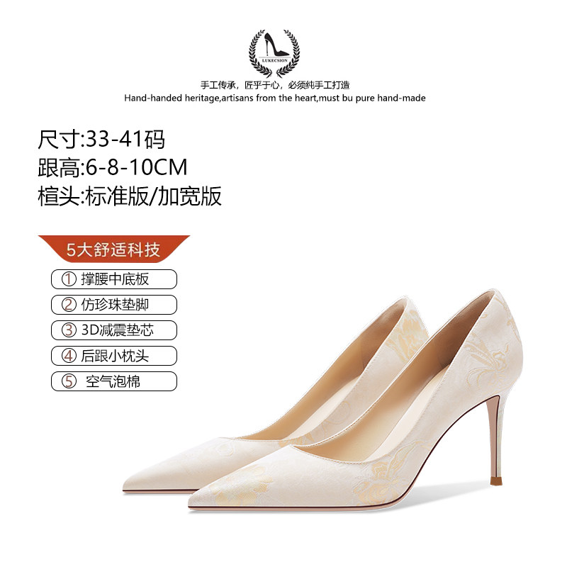 LUKE米白色绸缎高跟鞋女配旗袍气质高级细跟不累脚新中式新娘婚鞋