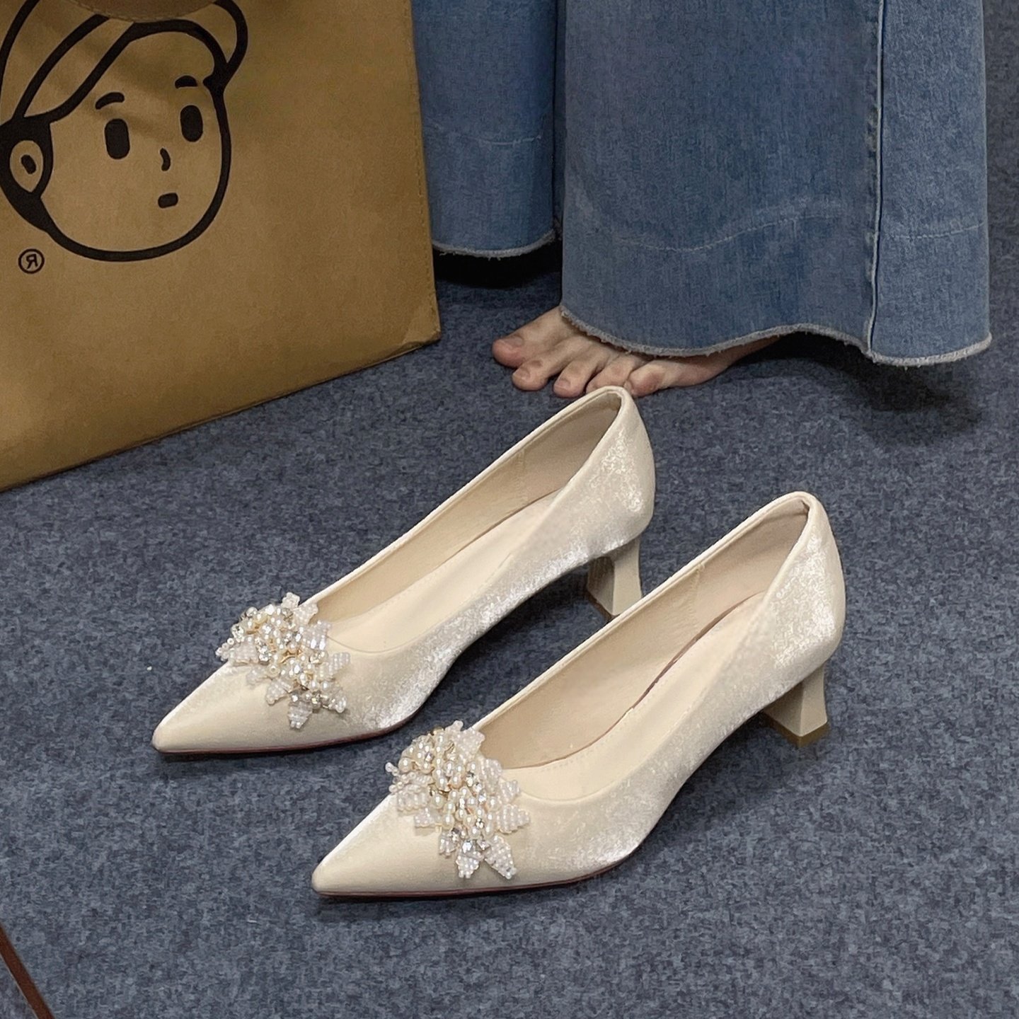 法式绝美绸缎高跟鞋女尖头珍珠伴娘不累脚新娘鞋粗跟日常可穿婚鞋