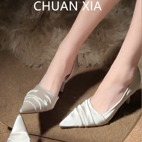 羊皮版~性感名媛尖头浅口单鞋女细跟褶皱绸缎高跟鞋法式侧空凉鞋