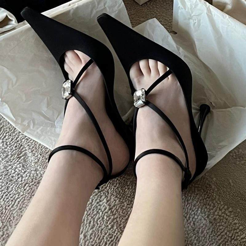 包头凉鞋女2025春新款仙女绸缎高跟鞋细跟尖头水钻法式气质单鞋黑