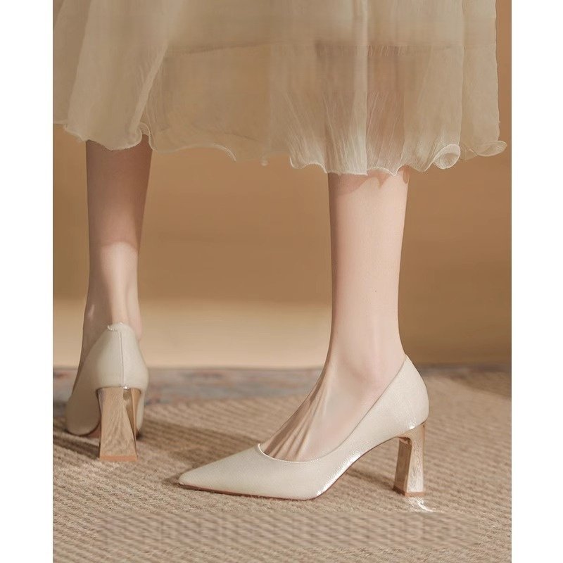 超软羊皮~法式粗跟绸缎高跟鞋女气质名媛方头温柔不累脚绝美单鞋