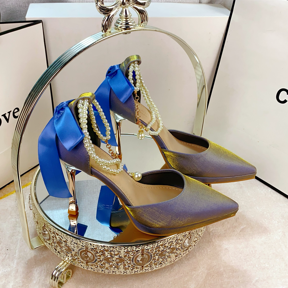 法式尖头绸缎高跟鞋女细跟珍珠链扣带蝴蝶结配旗袍鞋中空宴会婚鞋