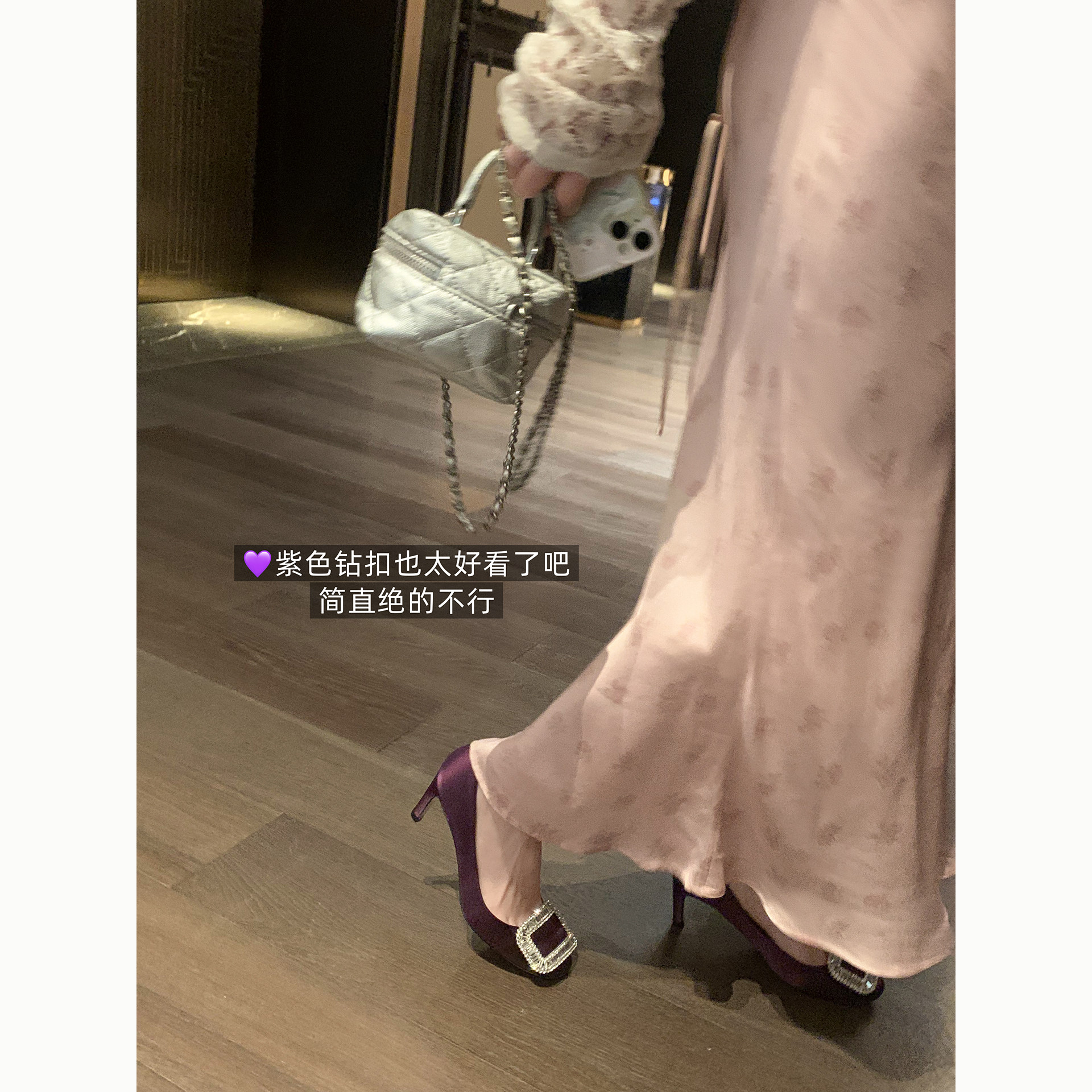 绝美紫色显白水钻绸缎高跟鞋2026春夏新款性感尖头细跟包头凉鞋女