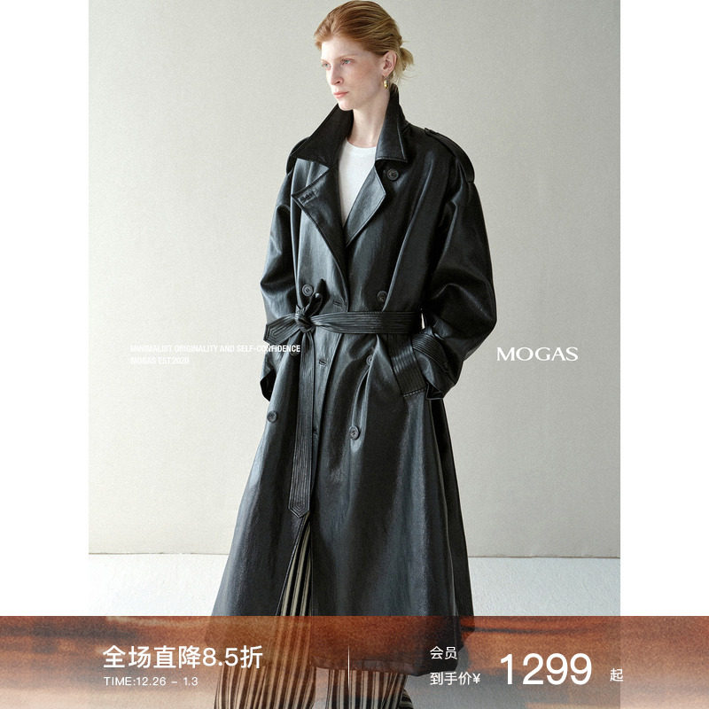 Mogas光影叙事 重工压线弹力金属丝经典廓形长款pu皮风衣外套女秋