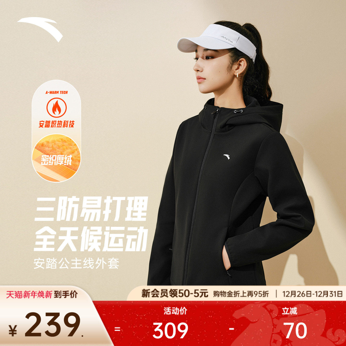 安踏防泼水外套丨开衫连帽风衣女装冬季加绒防风内胆梭织运动上衣