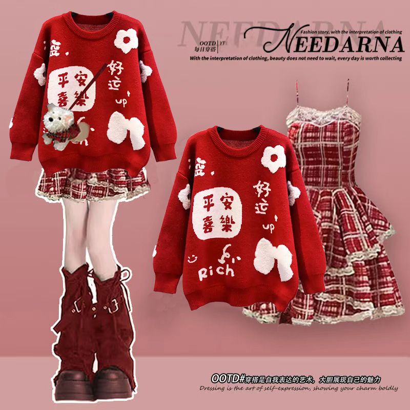 圣诞节女童服装秋冬红色毛衣连衣裙中大童洋气吊带裙打底衫裙子潮