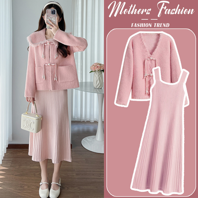 孕妇连衣裙套装秋冬2025新款粉色针织吊带裙毛衣外套减龄两件套女