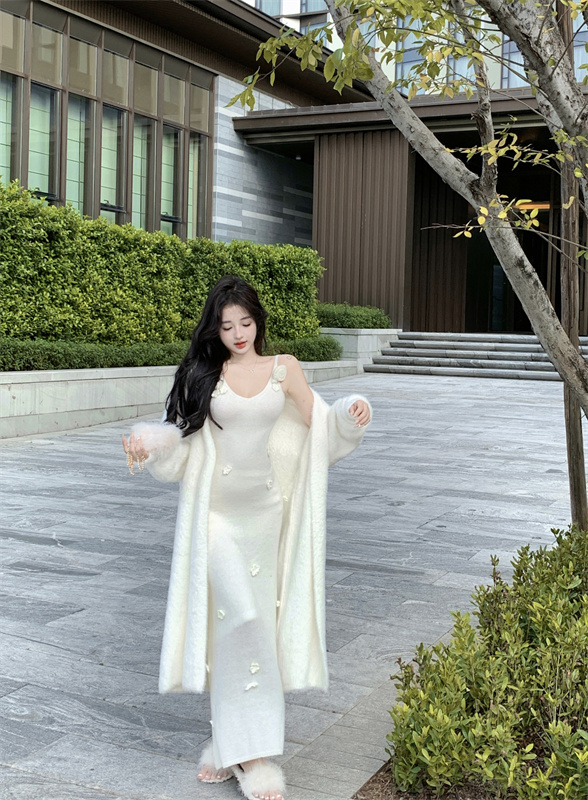 秋冬款温柔风白色半身长裙+吊带上衣+软糯毛衣针织外套两件套穿搭