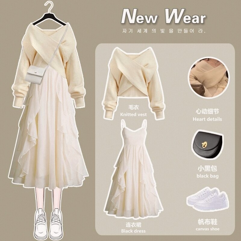 秋冬套装女2022新款温柔系穿搭洋气针织衫毛衣显瘦吊带裙两件套潮