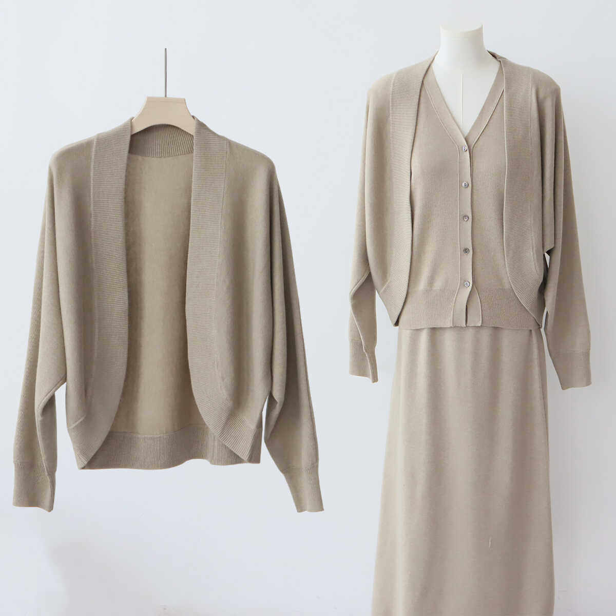 秋冬温柔茶系毛衣连衣裙套装慵懒宽松中长款针织开衫吊带裙两件套