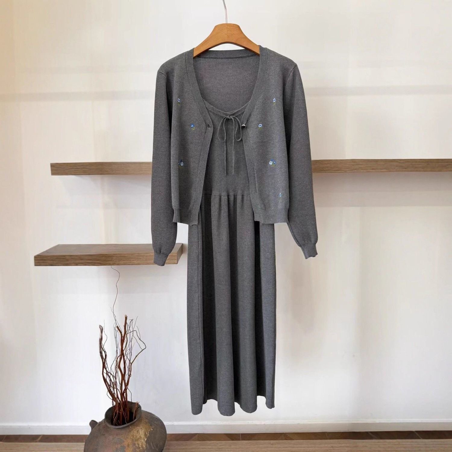 气质高级感灰色针织开衫吊带裙女两件套秋冬新款中长款毛衣套装女