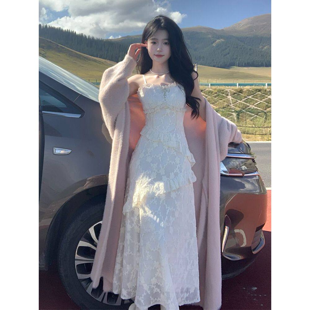 月下白茶 秋冬慵懒风毛衣初恋清纯荷叶边蕾丝绣花度假吊带裙套装