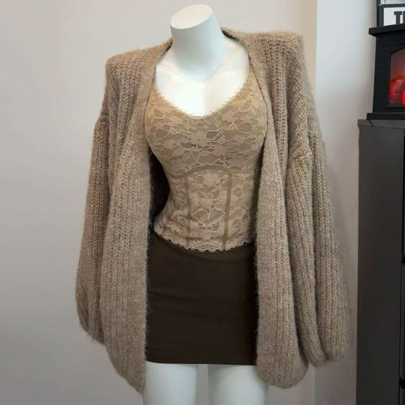 三件套女2025秋冬新款复古纯欲风宽松毛衣外套蕾丝吊带背心半身裙