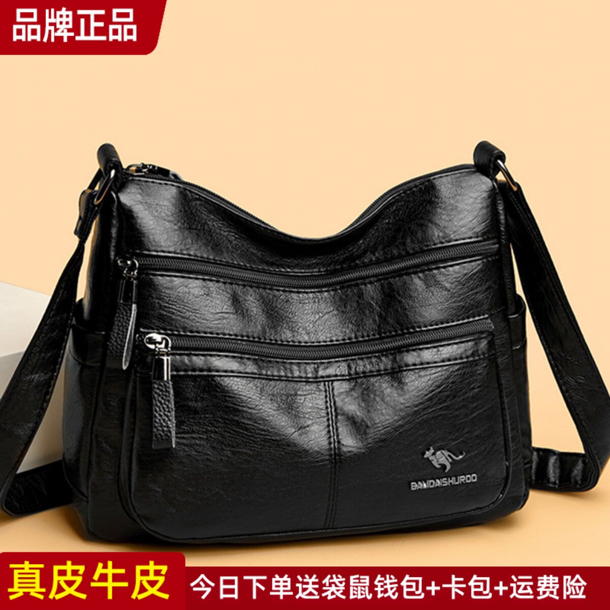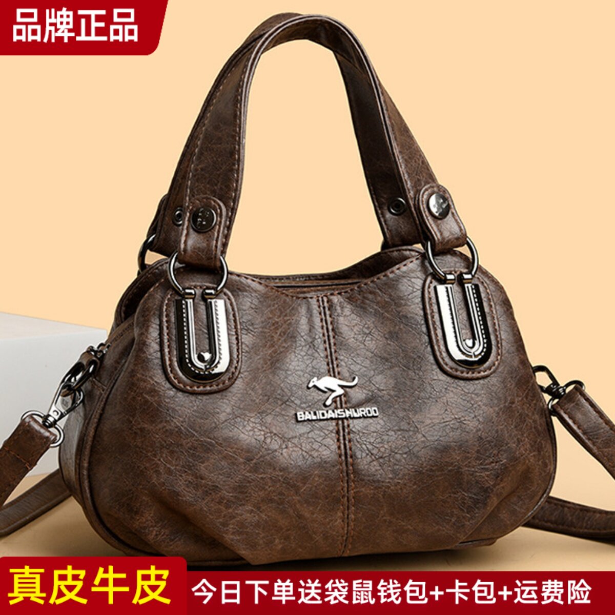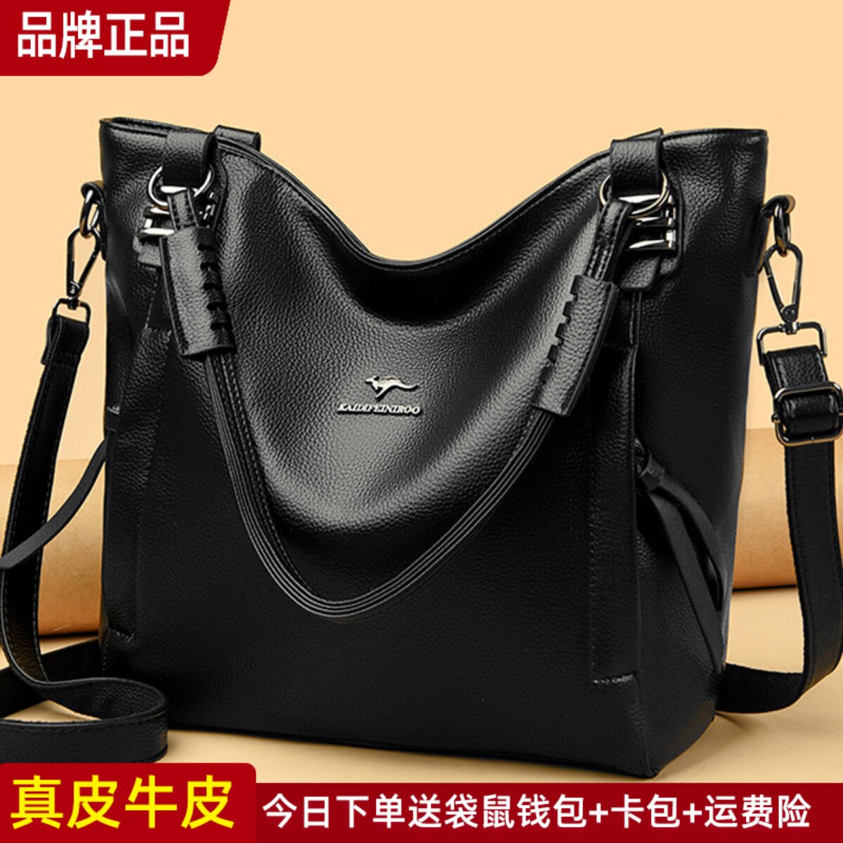 袋鼠真皮女包斜挎包包女士2026新款大包单肩包女大容量妈妈包牛皮