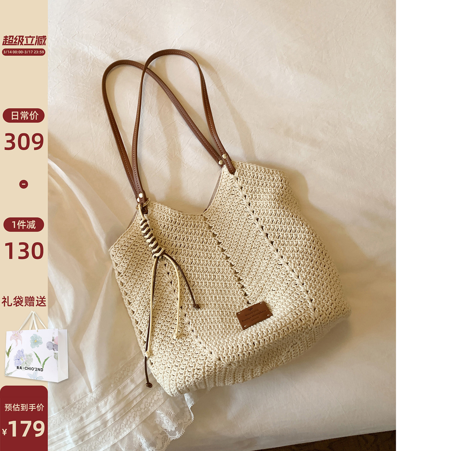 南风Chio2nd 牛皮肩带手工编织包慵懒风钩织托特包包女士单肩大包