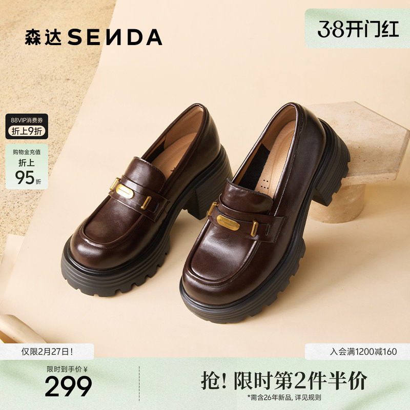 森达厚底乐福鞋女鞋2025新款秋季棕色英伦风松糕粗跟增高黑色单鞋