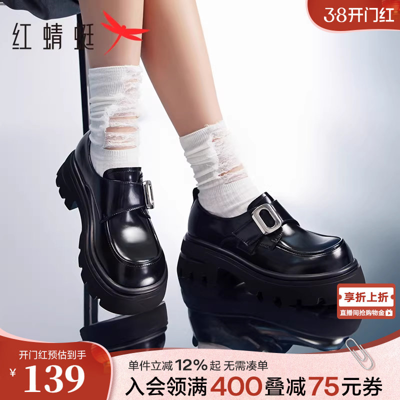 红蜻蜓厚底乐福鞋女新款松糕增高女鞋显瘦黑色单鞋英伦千金风皮鞋