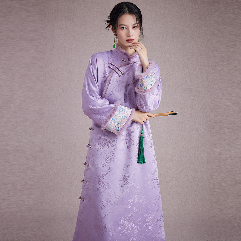 陌遇2025冬季国风新款 水貂毛拼接提花改良旗袍 新中式盘扣连衣裙