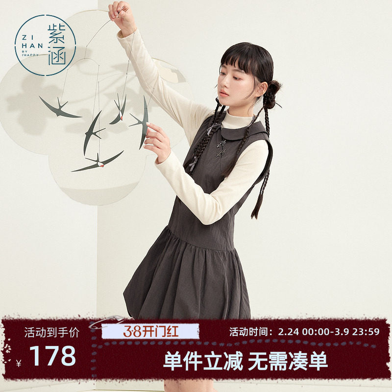 紫涵新中式翻领斜襟盘扣连衣裙女春秋季新款甜美休闲无袖花苞短裙