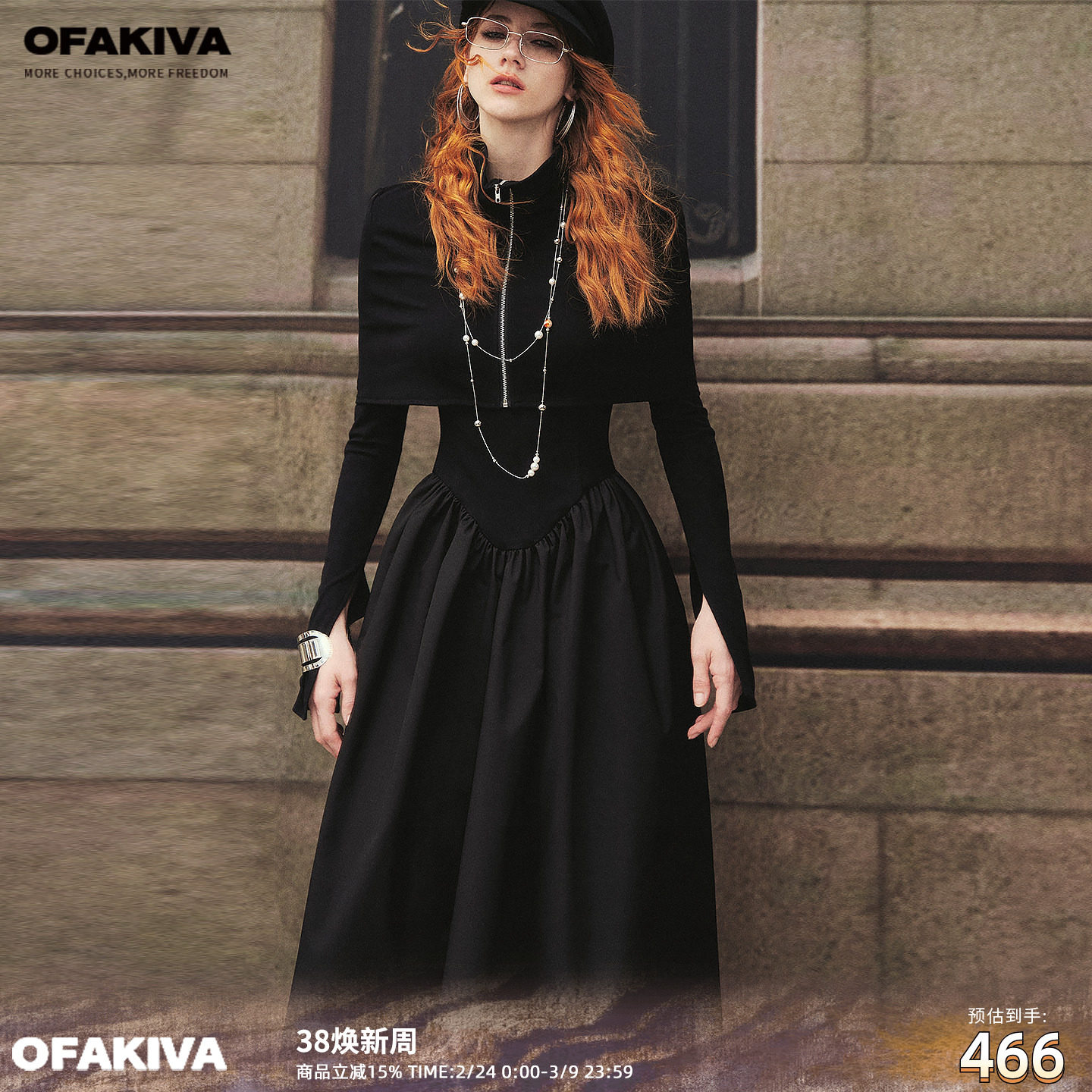 【现货】OfAkiva“黎明破晓”气质v领盘扣拼接大摆围长袖连衣裙