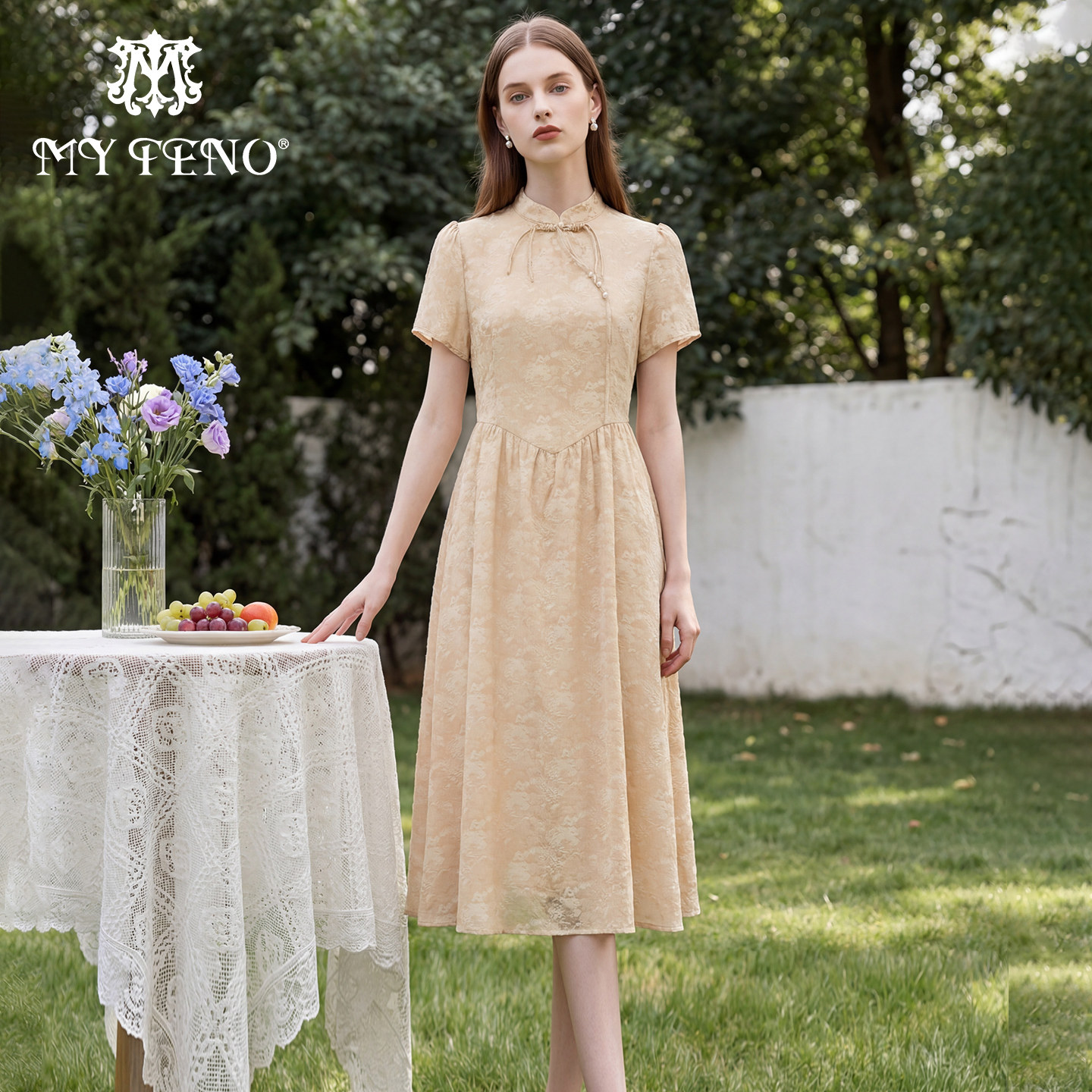 马天奴春夏新款提花立领盘扣连衣裙子新中式短袖女旗袍裙气质时尚
