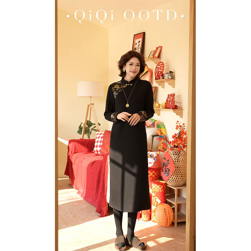 新年旗袍裙2025冬季新款气质女神减龄修身加绒刺绣国风盘扣连衣裙